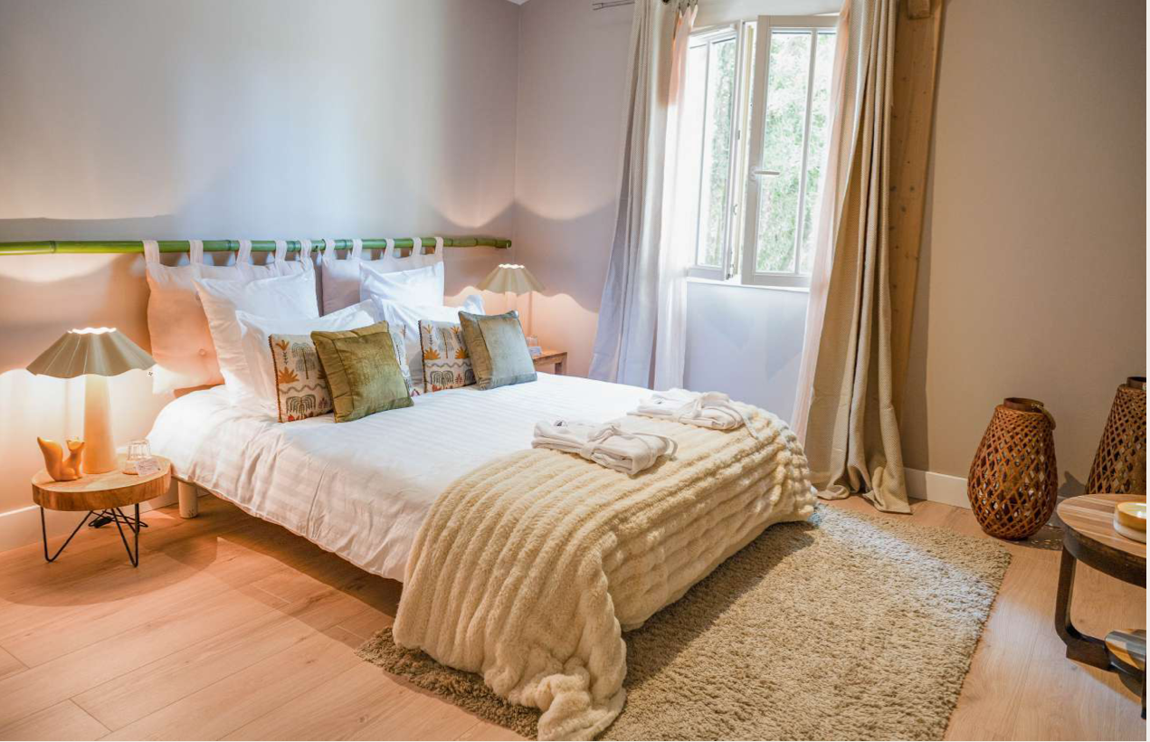 Located on the 1st floor, this is the largest suite in Villa La Tosca. This refined 80 m2 suite features two private terraces: one overlooking the Bassin and the gardens, and another overlooking the ecological swimming pool. Two dressing rooms, one for each guest, make this room feel extra spacious and luxurious.