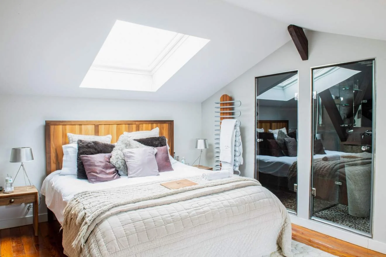 Located on the 2nd floor, Le Confort is perhaps our most romantic room. A former attic converted into a loft style room. The overhead skylight lets you drift into sleep as you gaze up at the starry sky.